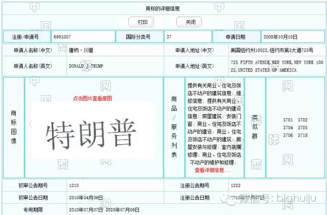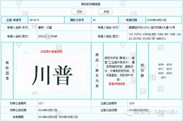 說(shuō)出來(lái)吓你(nǐ)一(yī)跳(tiào)¶✔←,早在2008年(nián),特朗普就(jiù)以自(zì)己名字的(de☆)英文(wén)“TRUMP”、中文(wén)譯名“特朗普”,申請(qǐng)了(le)第36、37、41、43、47類…幾十個(→∞gè)商标,申請(qǐng)人(rén)一(yī)欄都(dōu)是(shì)↕✔π£“唐納·川普”,這(zhè)是(shì)特朗普另一(yī)中文(wén)譯名。展示其中一(yī)個(gè):